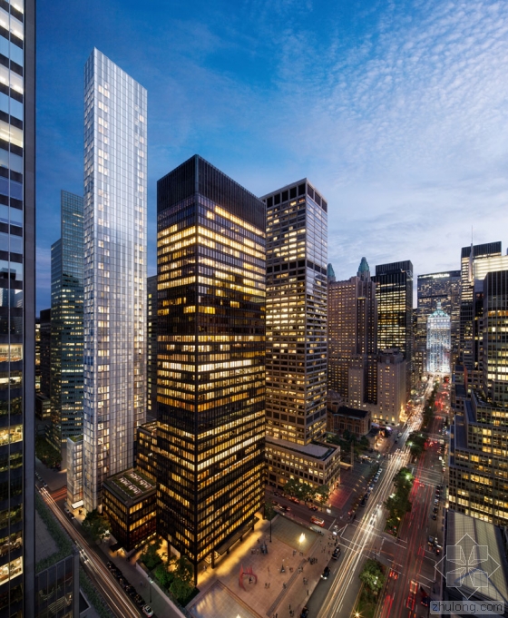 该项目是中国万科开发商与RFR的abyrosen合作。这座纤长的建筑探索了城市文脉与天际线之间的动态关系。在形式上,它呼应了相邻的两栋20世纪标志性现代风格的大厦的设计理念——即SOM设计的21层利华大厦(1952年)和密斯·凡·德罗设计的38层西格拉姆大厦(1958年)。