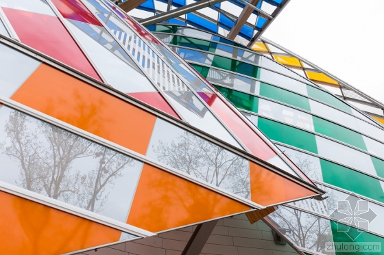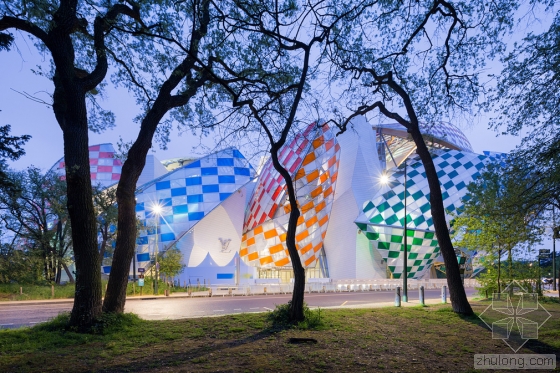 在艺术家Daniel Buren的设计下,由弗兰克·盖里设计的巴黎路易威登基金会的白色玻璃弧形船帆有了丰富多彩的色彩,更确切地说是13种颜色。与夏季十分搭配。Buren设计的临时格子,是与弗兰克·盖里联合开发的,名为“光之瞭望台(The Observatory of Light)”。该建筑的3528块玻璃板均使用了染色过滤器以及8.7厘米宽的白条,历时29个晚上,超过5个星期。