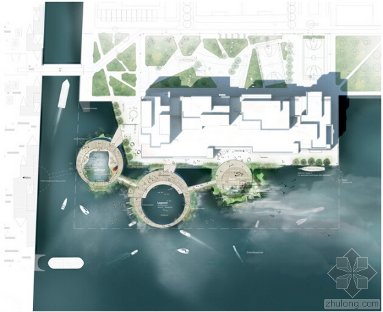 诺德海文群岛上的活动划分为三片区域,每个区域都有这自己的特点:“珊瑚礁”区,一个提供学习和活动的多功能平台,作为岸边的延伸空间;“泻湖”区,一个举办马球活动和其他水上活动的漂浮运动场;以及“日光浴”区,一个提供桑拿和游泳训练遮阳区的海港浴区。作为学校室内空间的眼神,该项目不仅提供了直接教学的功能,还可以服务于外来访客,成为码头的“社区中心”。