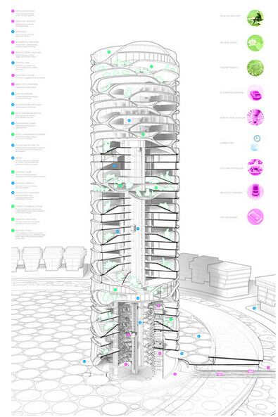摘要:David Tajchman为以色列特拉维夫市设计了一座新圆柱形摩天大楼方案,该建筑使用了“镜像玻璃表皮”和白色混凝土。整座建筑包括公寓、酒店、自动停车库、公共充电站、农场与公共花园、联合办公等多重功能空间。