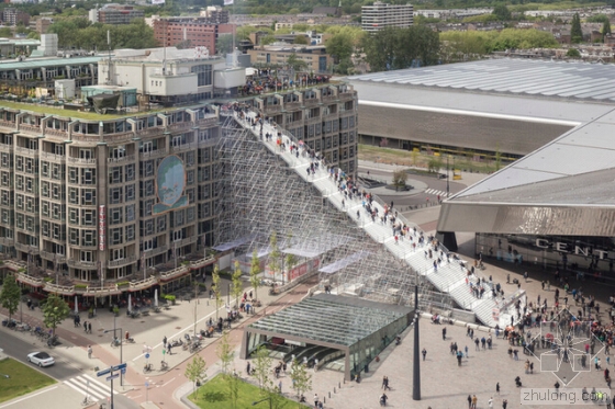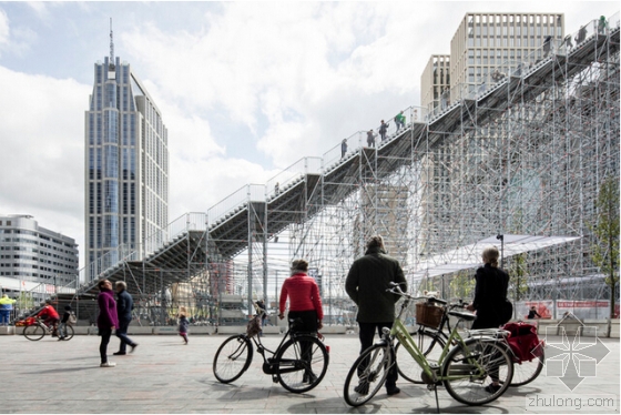 继鹿特丹工作室MVRDV公布了新的临时城市构筑——一个高29米、长57米的180级巨型楼梯——后的几个月,这个位于鹿特丹市中心的项目正式开放。那些登上楼梯的游客将抵达可欣赏鹿特丹市中心风景的临时观景平台、屋顶酒吧以及临时开放的、曾活跃于60年代的Kriterion电影院。